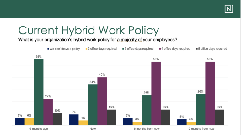 In six months, 66% of firms expect at least 4 days and over 90% at least 3 days in-office. 83% of firms have different hybrid rules depending on department.